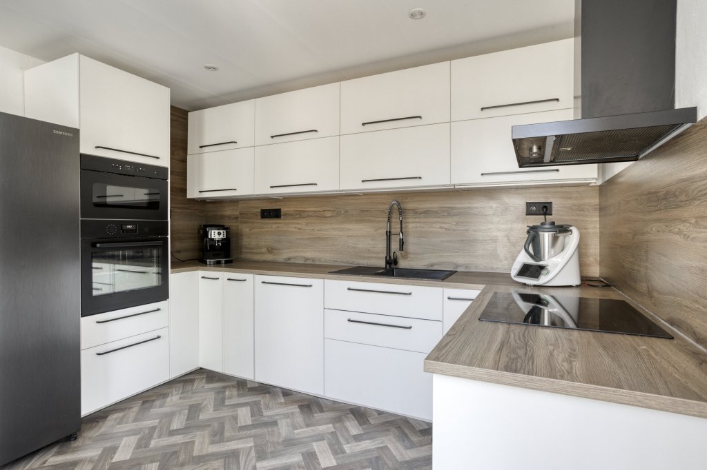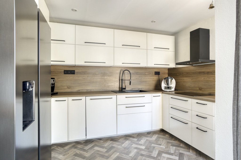De keuken is recent vernieuwd en voorzien van moderne apparatuur, waaronder een inductiekookplaat, ingebouwde oven, magnetron, vaatwasser én een moderne Amerikaanse koelkast met icecrusher (ter overname). De wit afgewerkte kastfronten in combinatie met houten details geven de keuken een eigentijdse en warme uitstraling. Dankzij de praktische indeling is koken hier een waar plezier.
