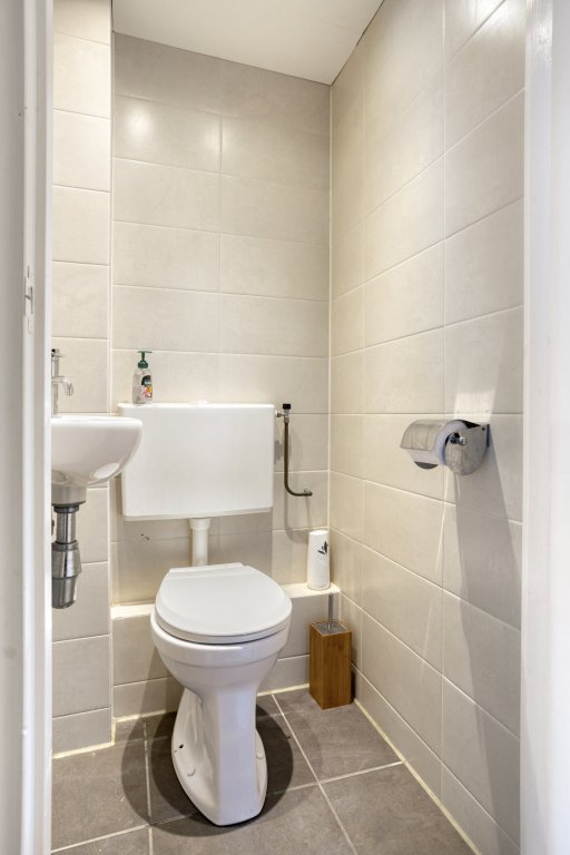 Netjes en smaakvol betegeld, met fonteintje passend bij de verzorgde afwerking van de woning.