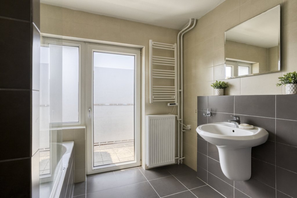 Fraai afgewerkt met moderne tegels en voorzien van een ligbad, aparte douche, toilet en wastafel. Vanuit de badkamer heeft u toegang tot een balkon.
