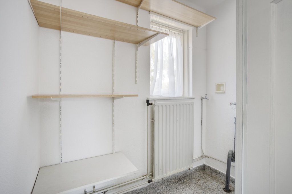 Praktische ruimte met aansluiting voor wasmachine en droger, en voldoende plek voor het opbergen van huishoudelijke spullen.