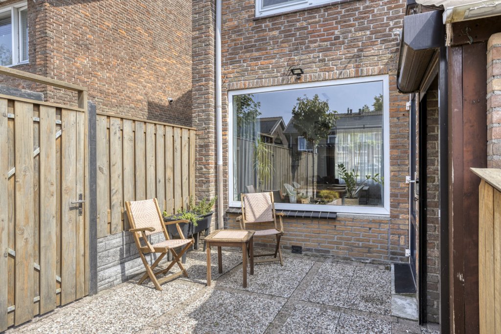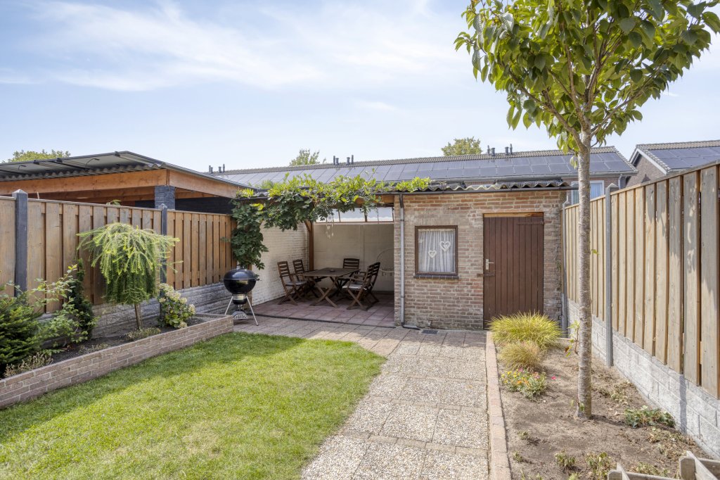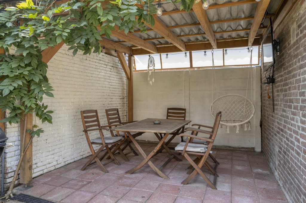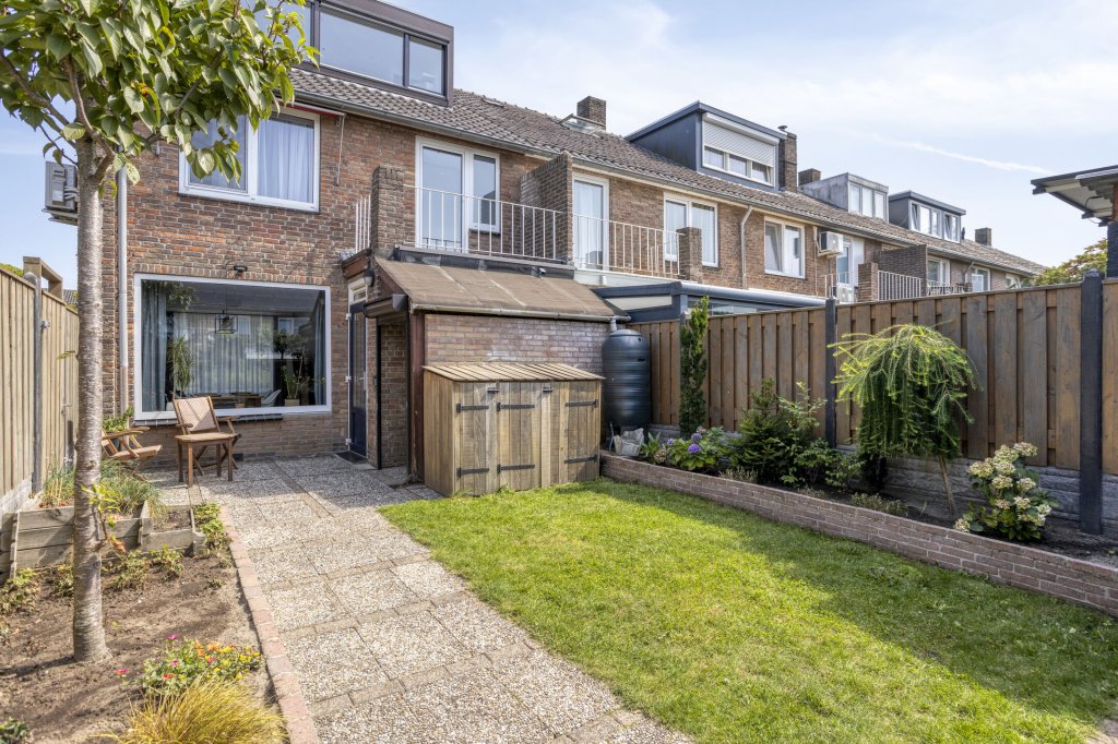 De royale achtertuin(ongeveer 51m2) is half betegeld en deels voorzien van een groen grasveld. Aan de zijkanten is ruimte voor fraaie beplanting, waardoor u eenvoudig een gezellige en groene sfeer kunt creëren. Naast de tuiningang is ruimte voor een Kleine berging. Achterin de tuin staat een praktische schuur voor opslag en een overkapping waar u beschut kunt genieten van het buitenleven, ongeacht het weer. Dankzij de brede steeg aan de zijkant is de tuin ook eenvoudig bereikbaar via de achterom.