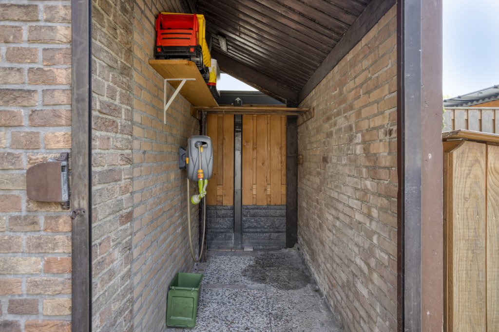-Royale achtertuin met berging, stenen schuur, overkapping en achterom via brede steeg;