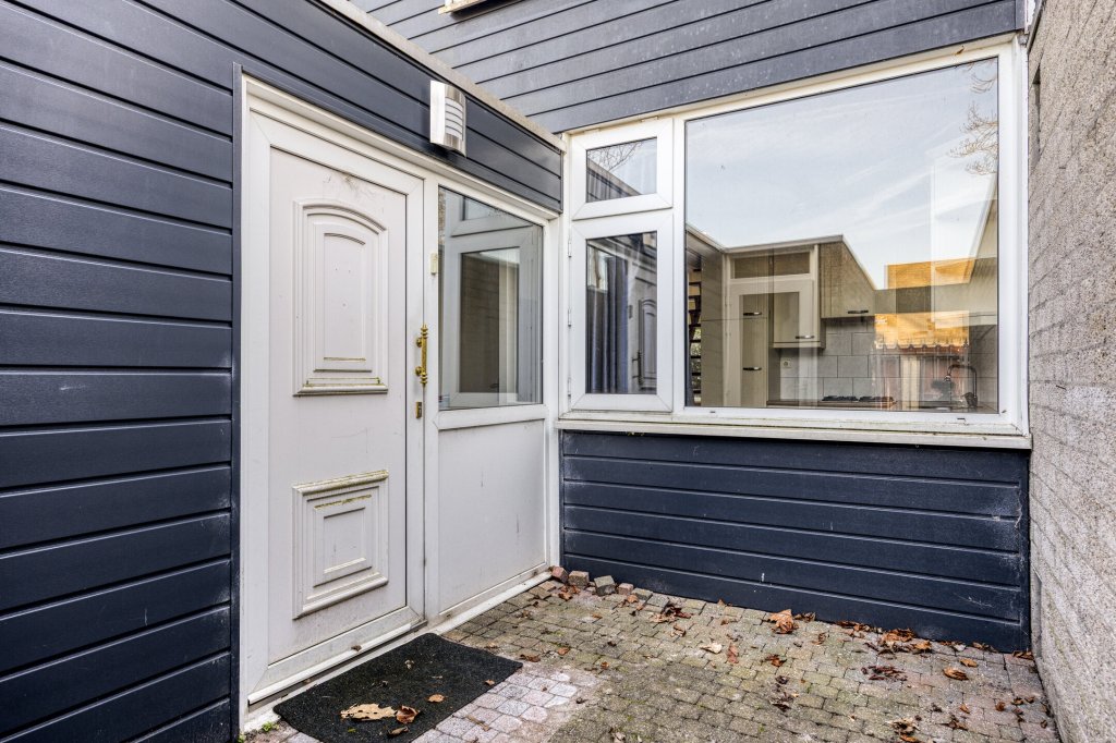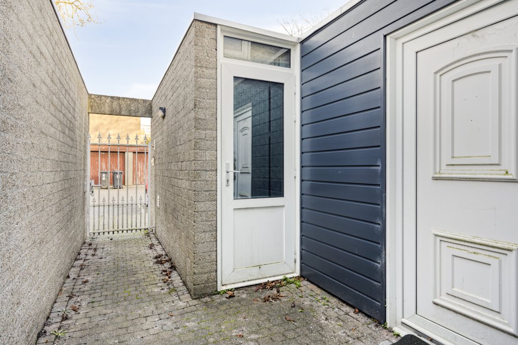 Via een poortje is de betegelde voortuin bereikbaar, met ruimte voor fietsen en containers.