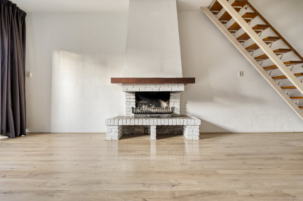 De woonkamer is licht en beschikt over een open haard. Een ruimte met veel potentie om hier een comfortabele en sfeervolle leefruimte van te maken.