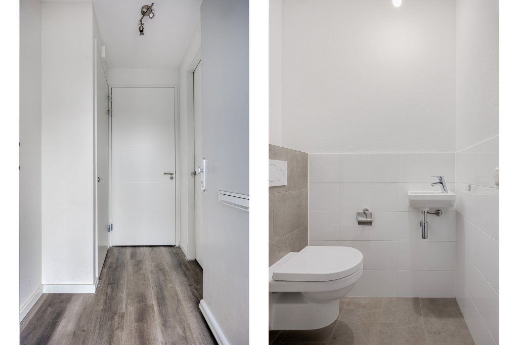 Entree met hal en toilet. Aan de voorzijde bevindt zich de moderne keuken, compleet met
