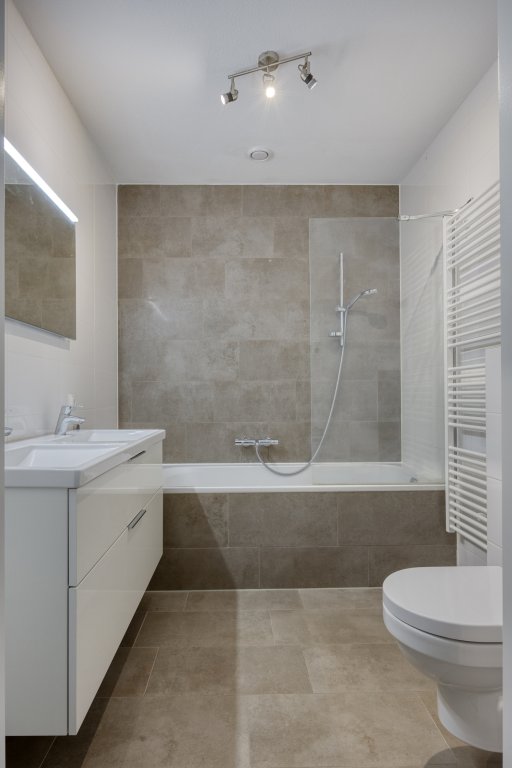 vloerverwarming die apart regelbaar is. De moderne badkamer beschikt over een ligbad-