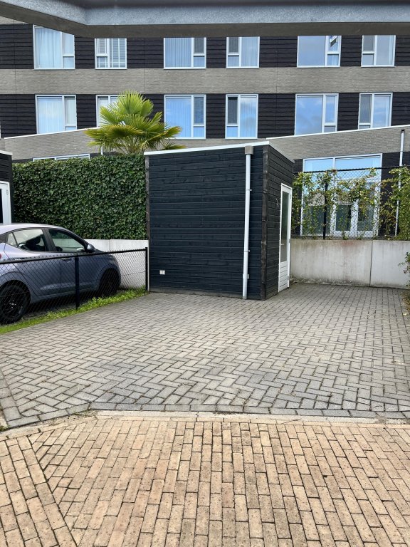 de tuin(ca. 28m2) met berging en twee eigen parkeerplaatsen. Deze is al voorbereid voor