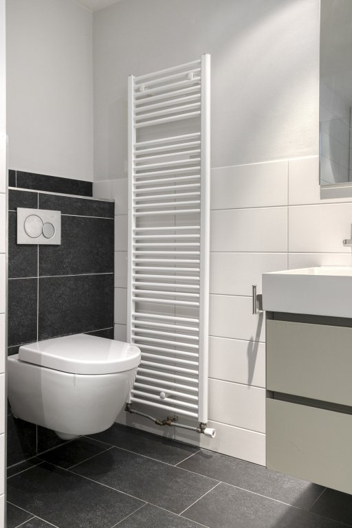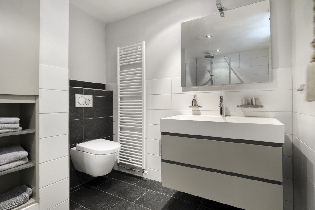 De badkamer is modern afgewerkt en voorzien van een douche, wastafelmeubel en toilet. Alles wat u nodig heeft voor een comfortabele en verzorgde dagelijkse routine is hier aanwezig.