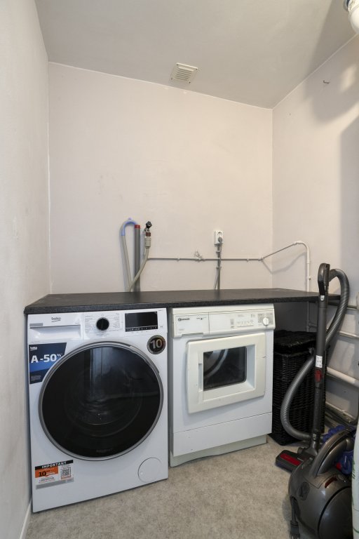 Op de bovenverdieping bevindt zich een aparte wasruimte met aansluitingen voor wasmachine en droger. Een handige plek om het huishoudelijk werk uit het zicht en goed georganiseerd te houden.