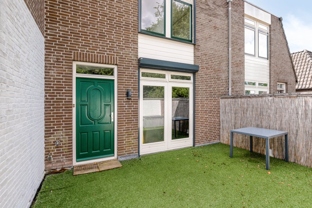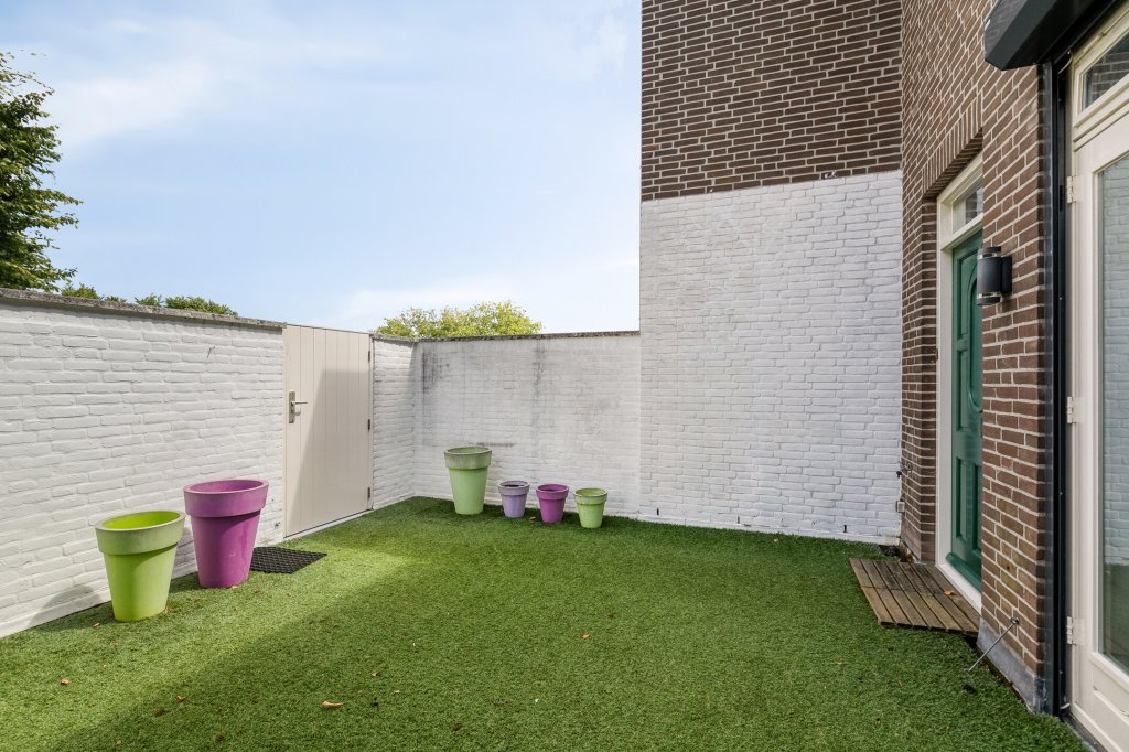 Aan de voorzijde van de woning ligt een terras voor de woning van circa 24 m². Deze buitenruimte biedt privacy en is geschikt voor een gezellig zitje of een groenvoorziening
